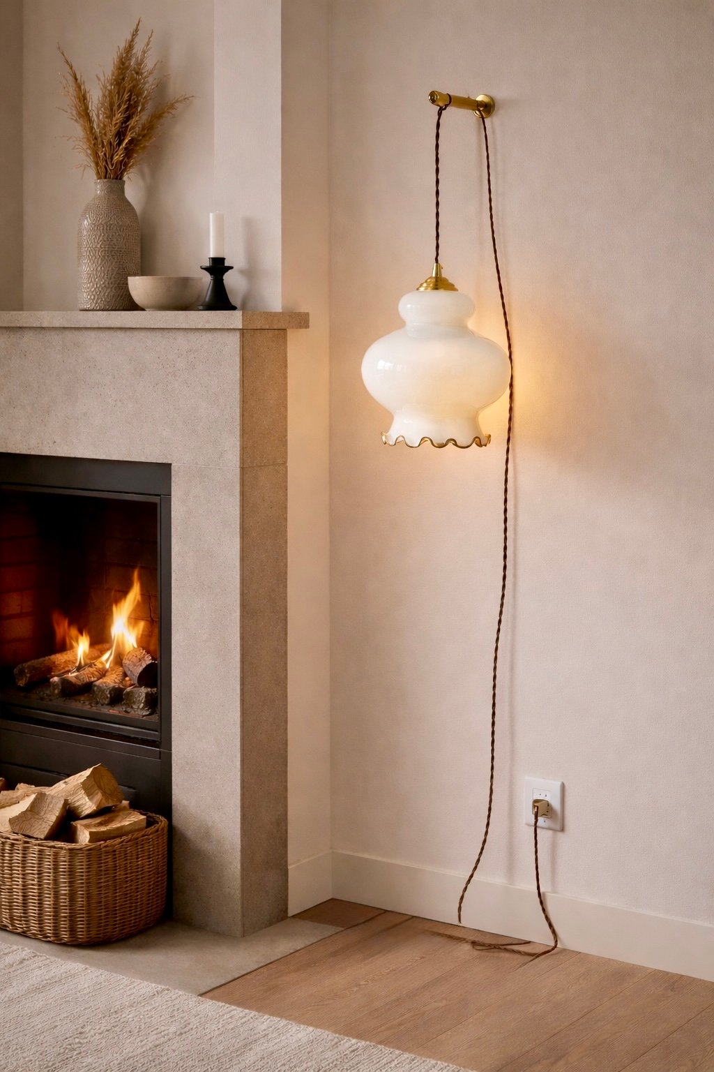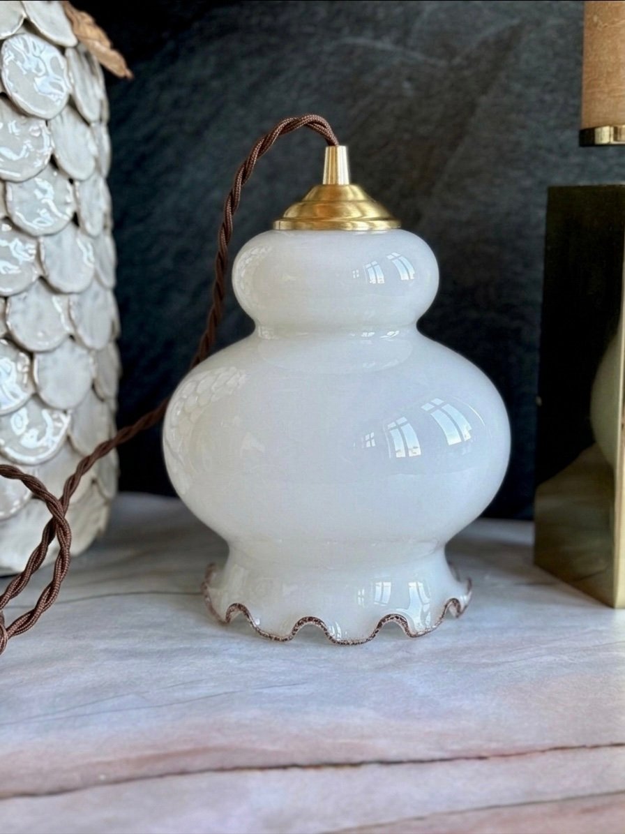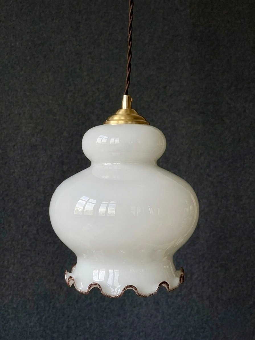 Le blanc profond du globe diffuse une lumière ample et homogène, sans dureté, créant une atmosphère feutrée et chaleureuse. Le bord délicatement ondulé, subtilement ourlé d’un liseré plus sombre, vient signer la pièce avec finesse, comme un dernier geste du verrier.