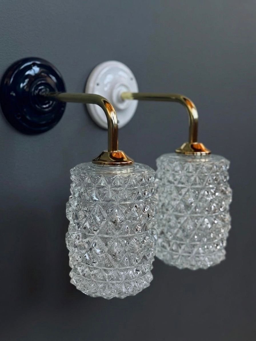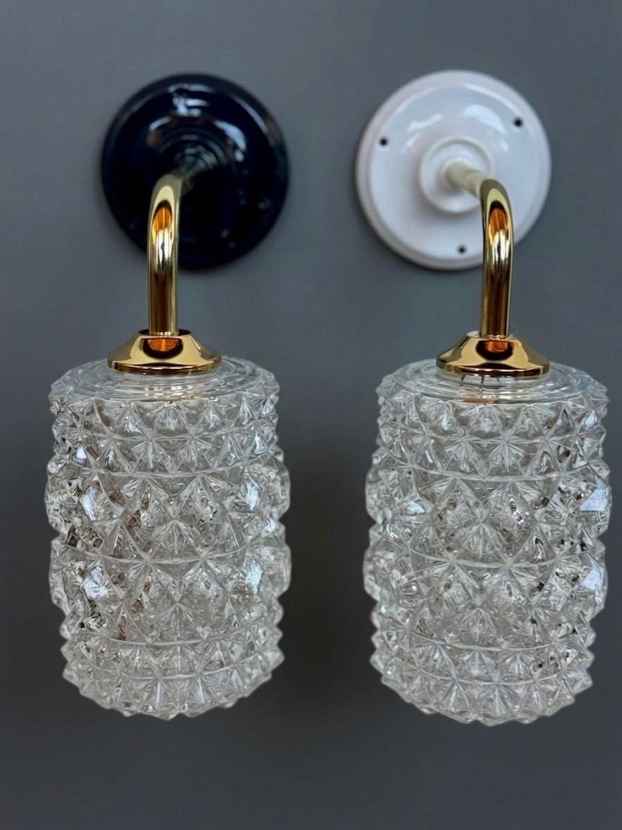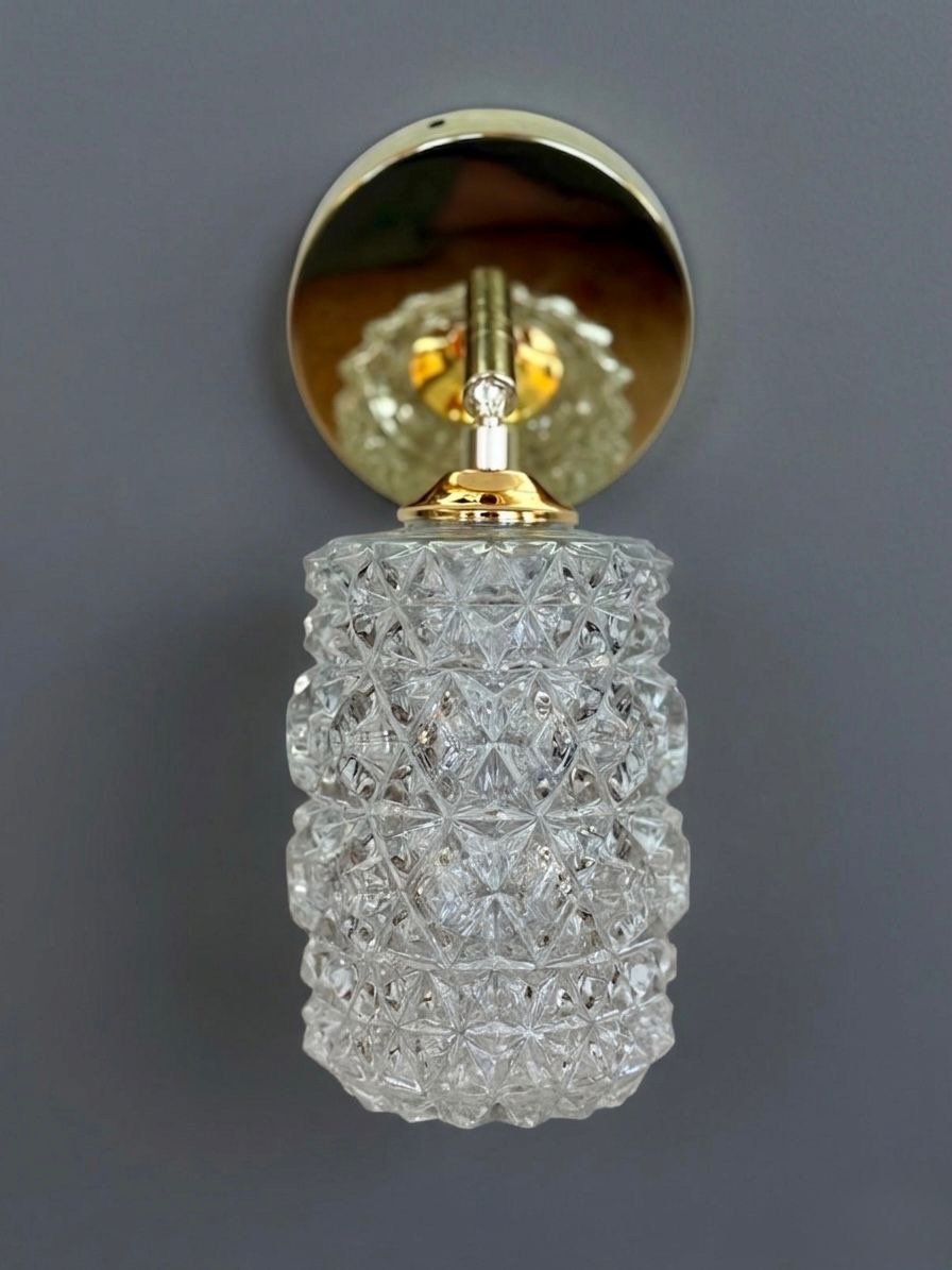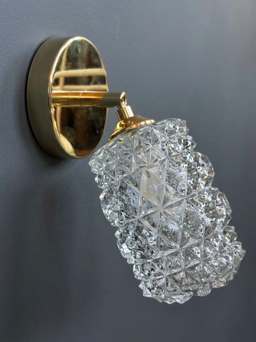 Ces appliques semblent avoir capturé la lumière dans une matière vivante. Le verre pressé, richement travaillé, déploie un motif géométrique dense aux reliefs presque cristallins. Chaque facette accroche la lumière, la fragmente, la renvoie, créant une présence lumineuse vibrante sans jamais être ostentatoire.