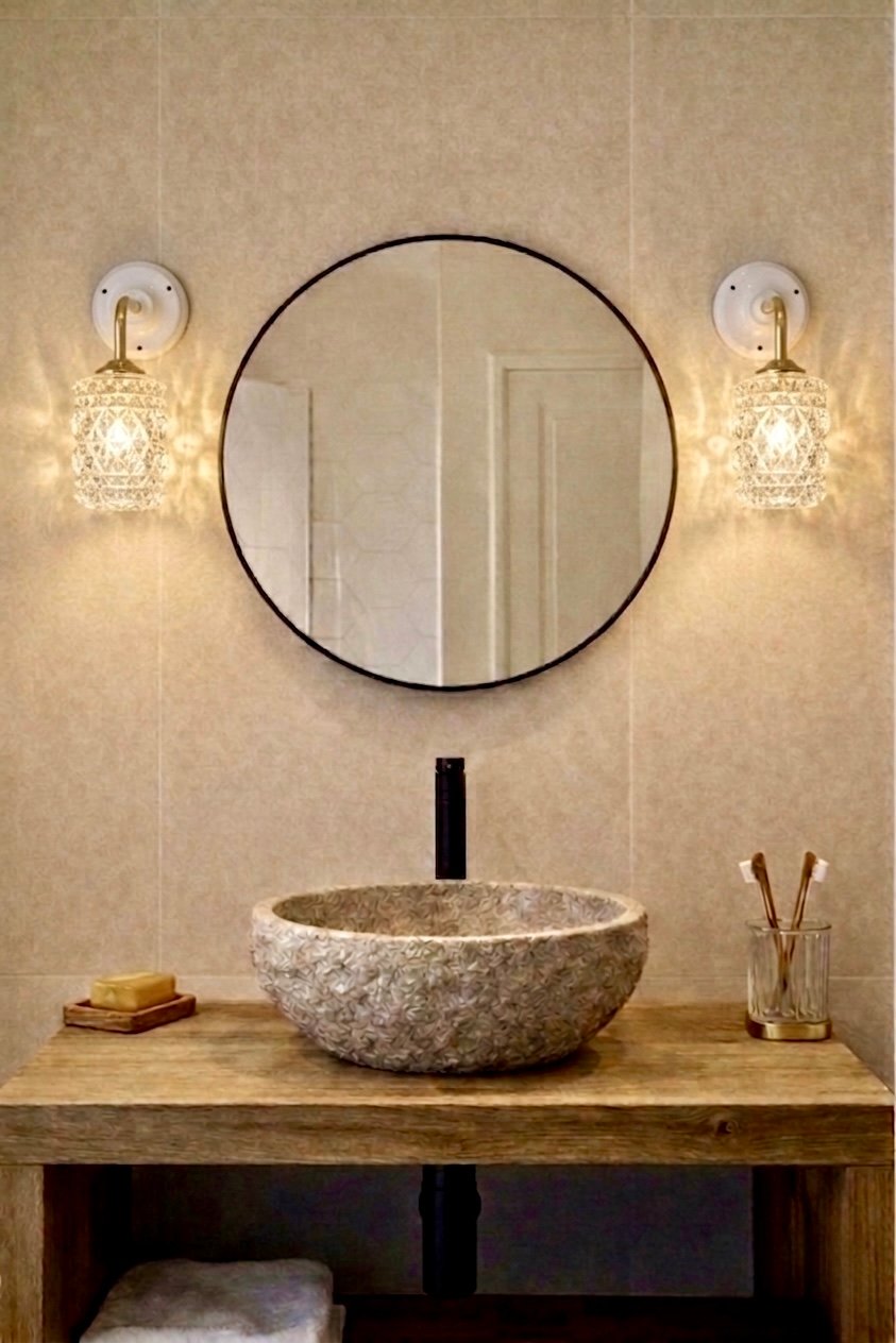 Le dialogue se prolonge jusqu’au mur avec un choix de rosaces en porcelaine blanche, noire, ou en laiton doré, à accorder selon l’ambiance souhaitée.
