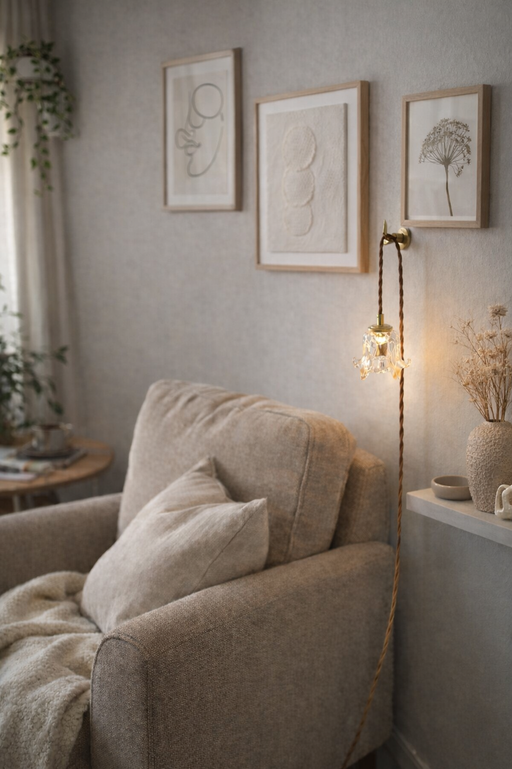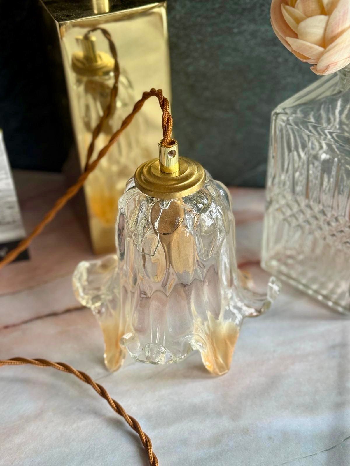 Montée sur une finition en laiton et suspendue à son cordon textile, elle s’impose avec douceur, comme une présence vivante dans l’espace.