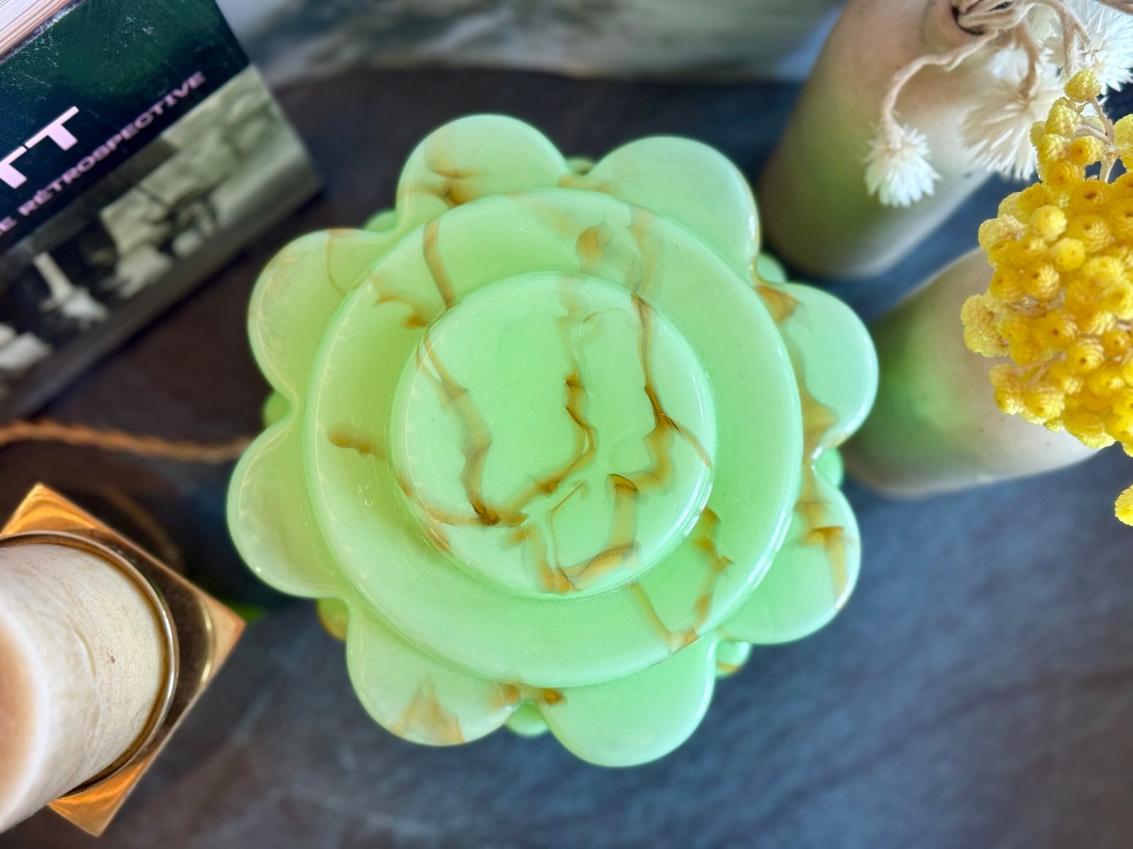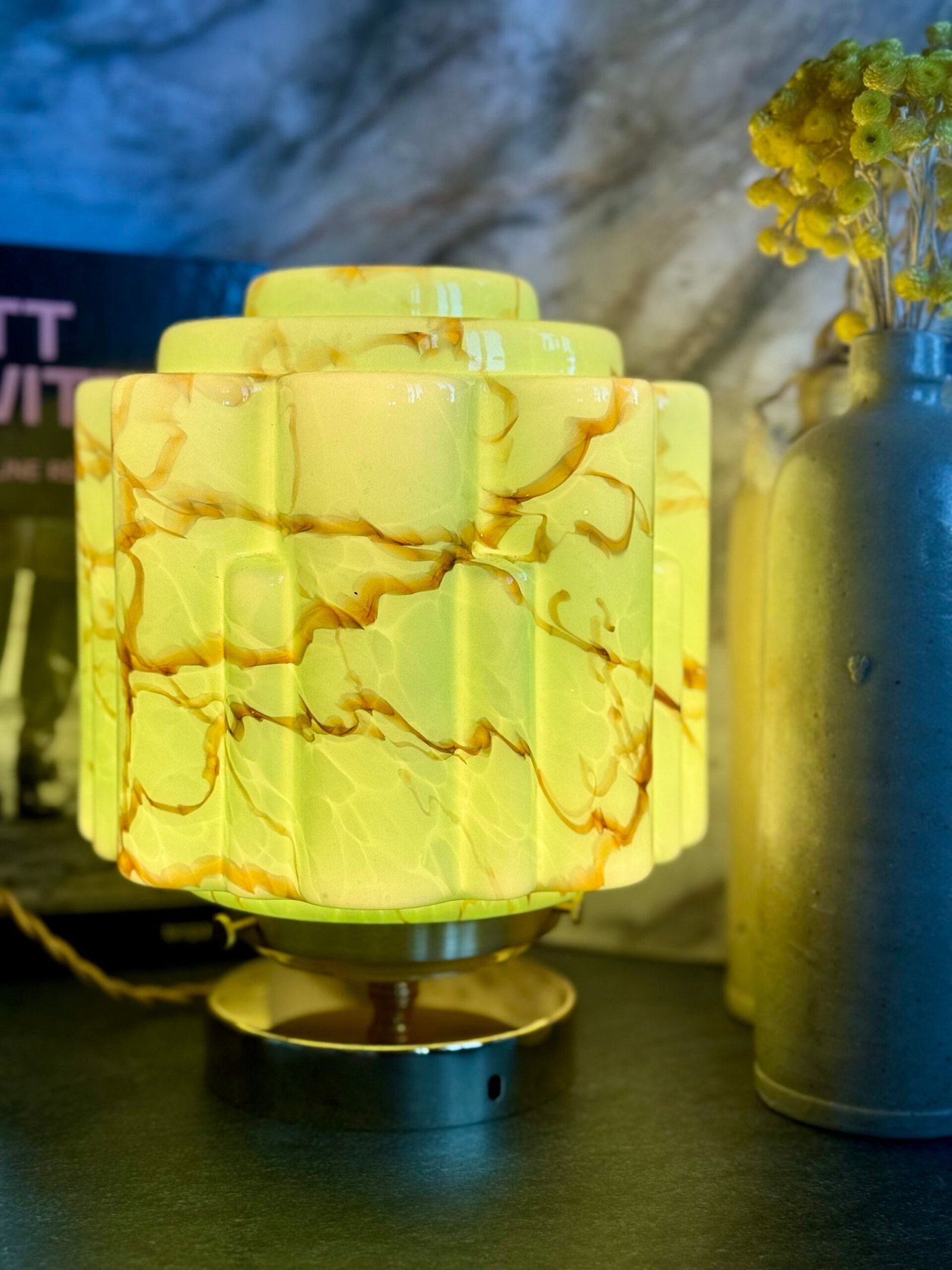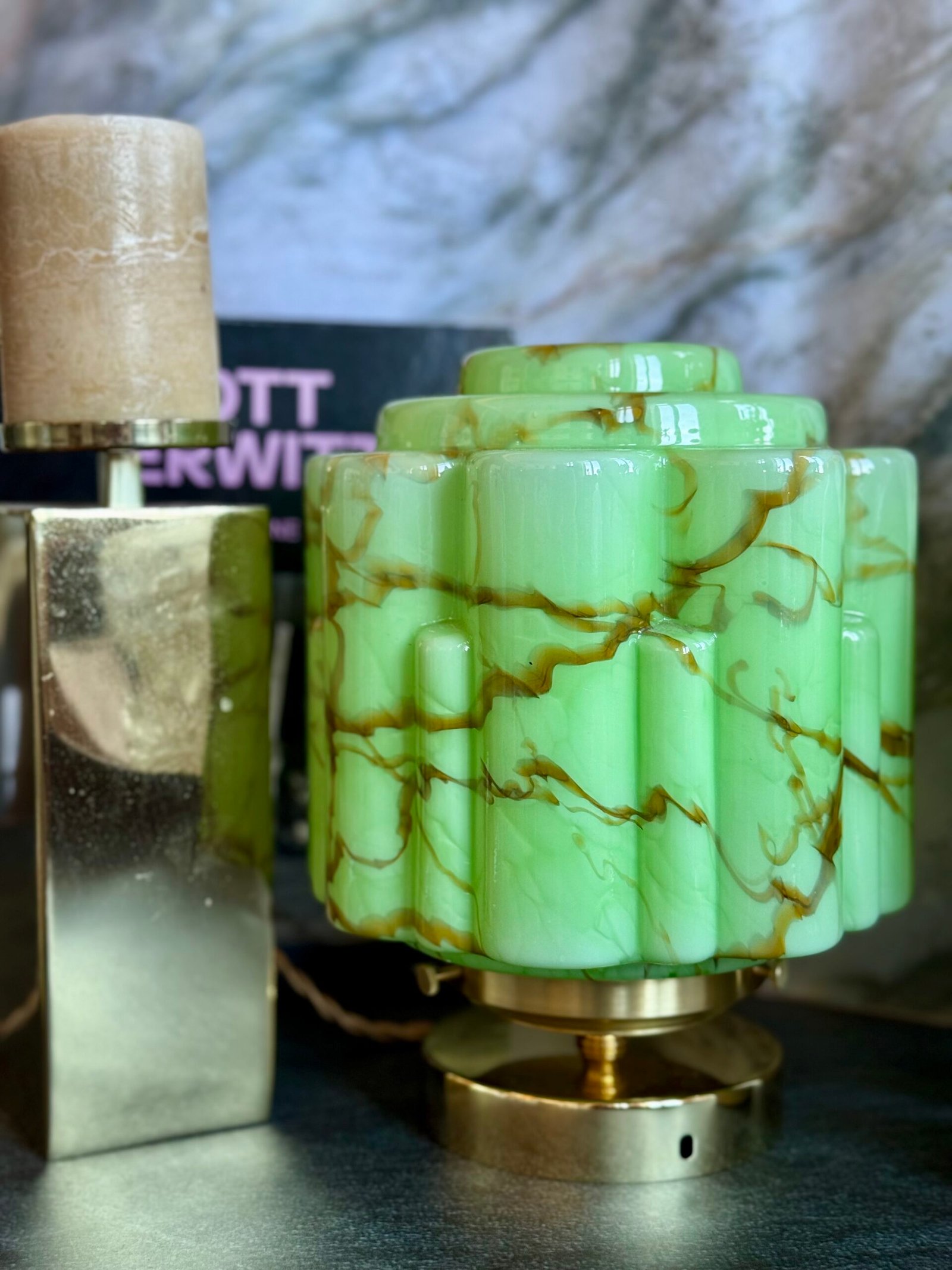 Le globe en opaline verte marbrée, typique de l’esthétique Art déco, révèle de riches nuances vert jade traversées de veines aux tonalités plus chaudes. Ces marbrures donnent au verre un aspect presque minéral, rappelant les dessins naturels d’une pierre polie.