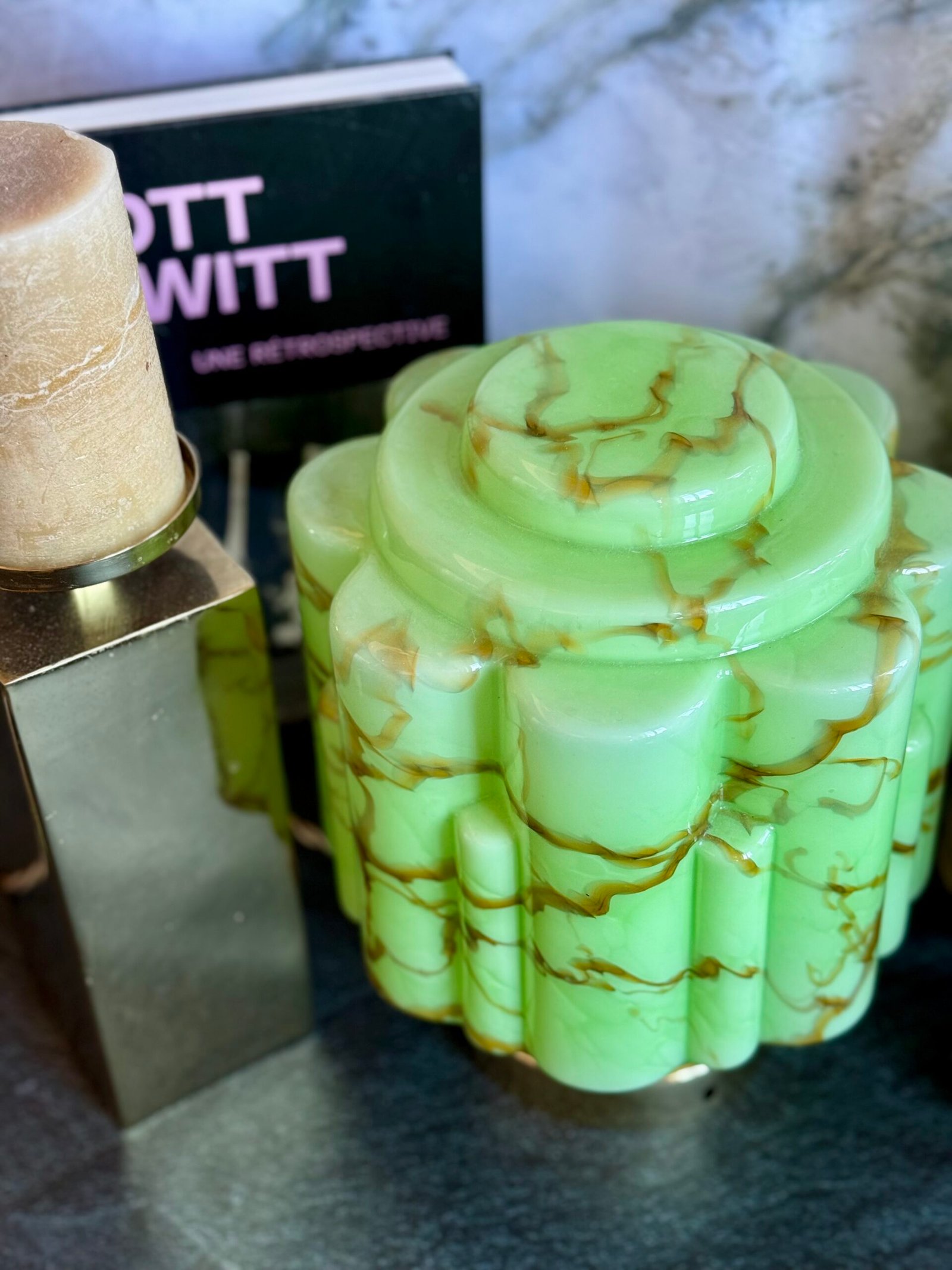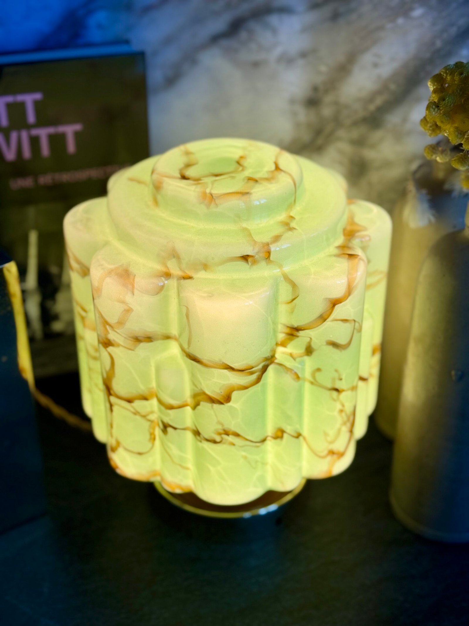 Allumée, Jade Marbré diffuse une lumière douce et enveloppante, révélant toute la beauté de son opaline et la singularité de ses marbrures.