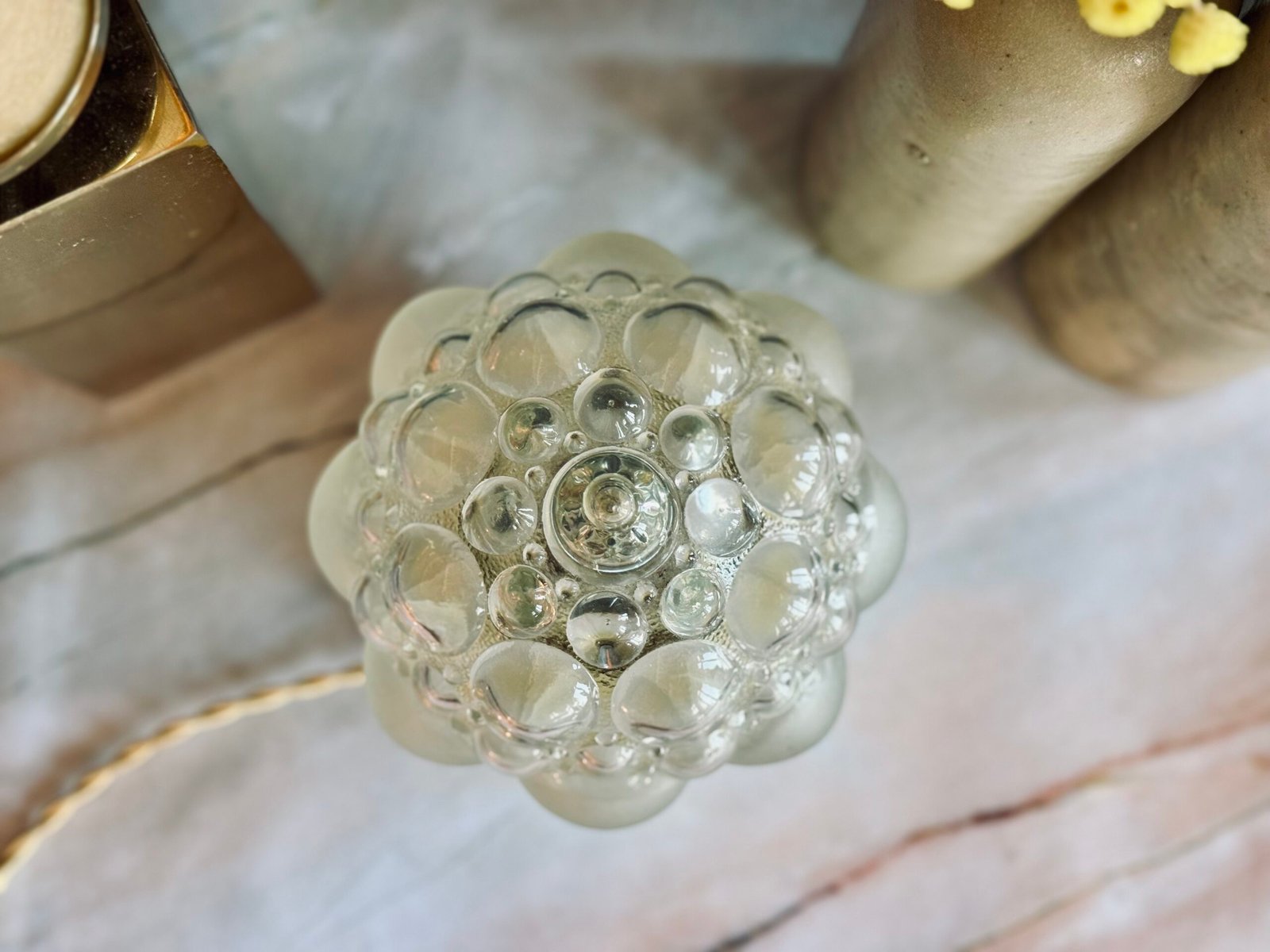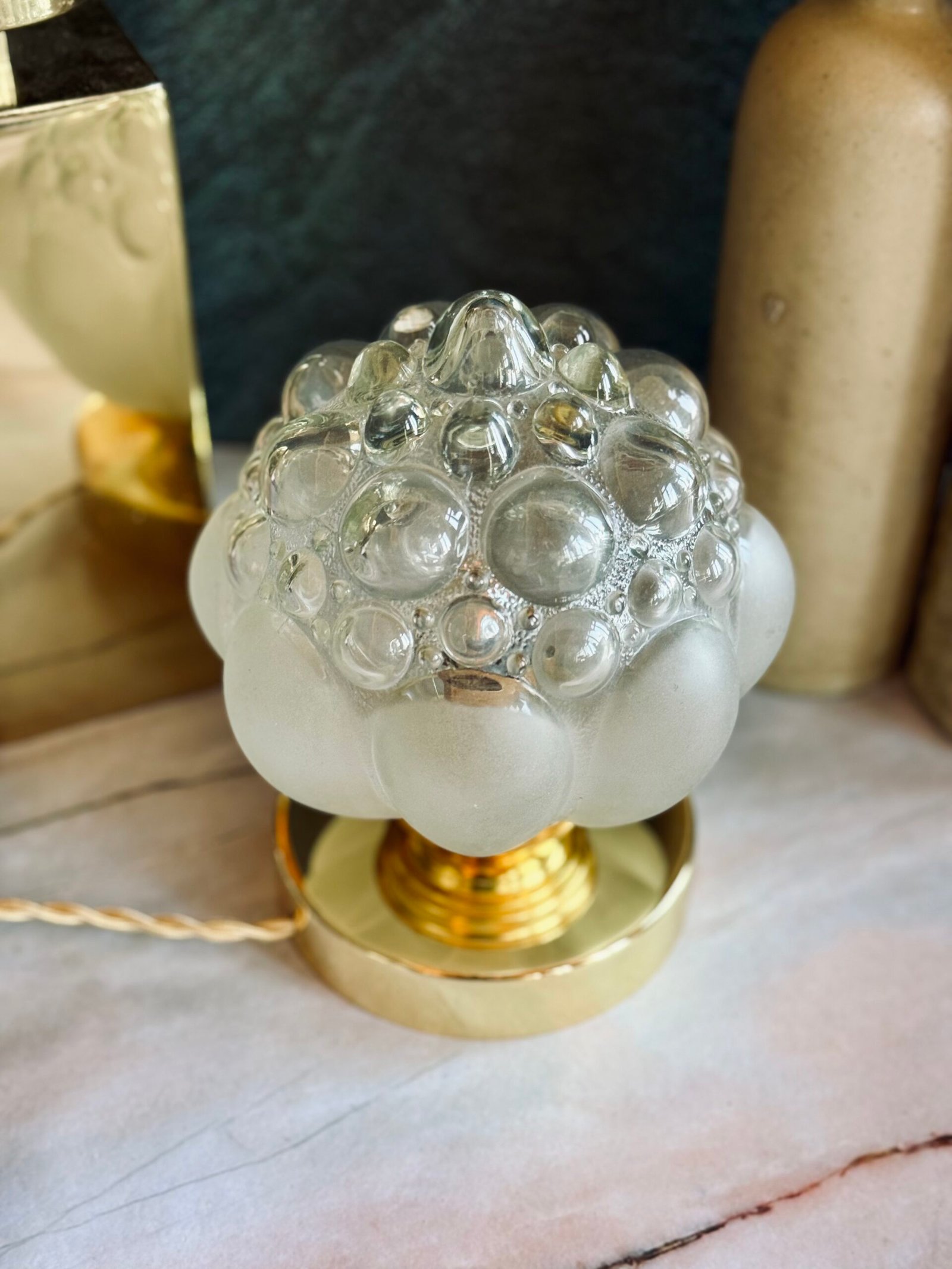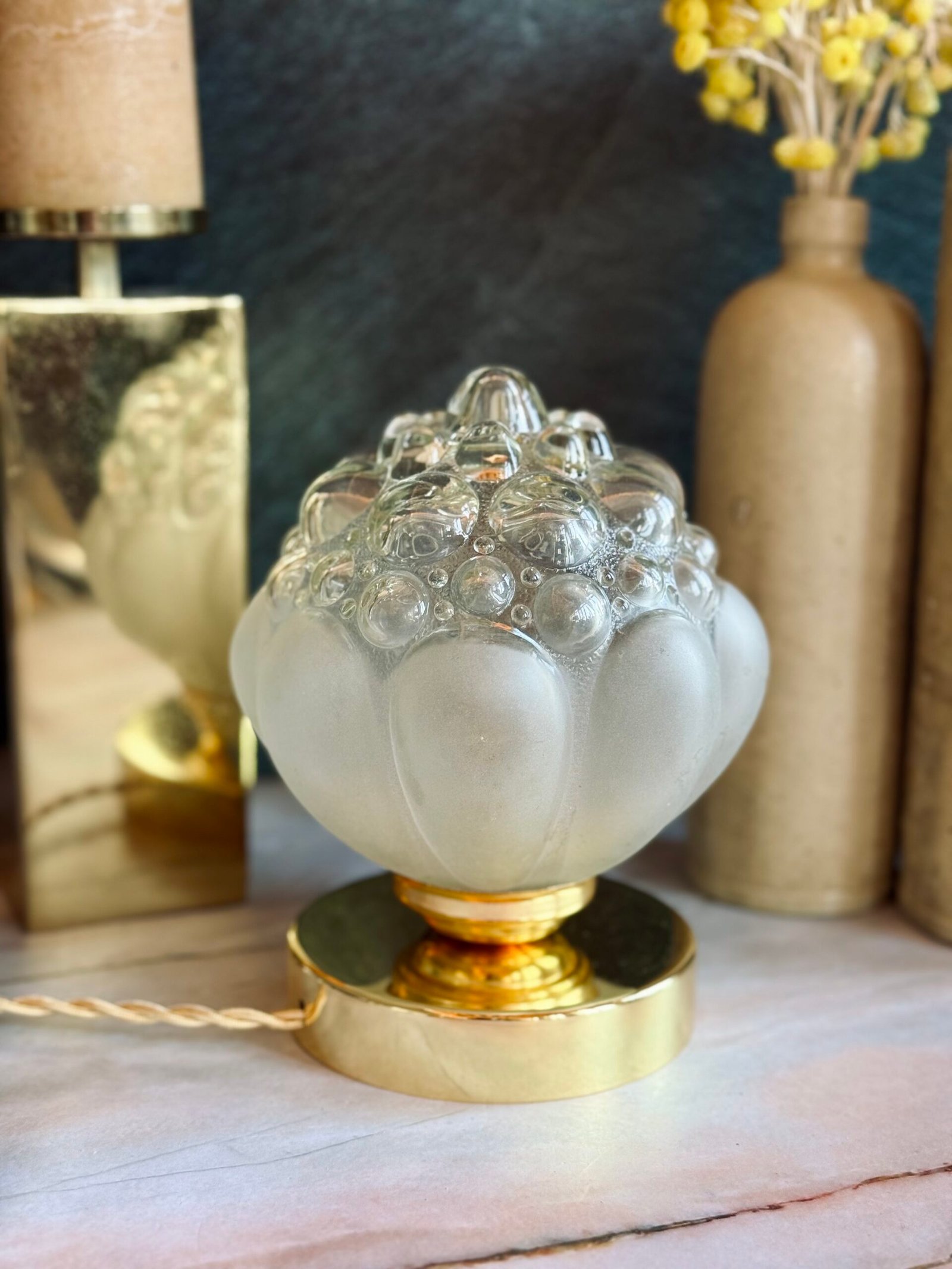 Ce globe ancien en verre moulé associe deux textures en dialogue : une base en verre dépoli, douce et satinée, et une partie supérieure ponctuée de reliefs en cabochons, comme une constellation de bulles figées dans le cristal. Une composition riche, presque organique, qui capte immédiatement le regard.