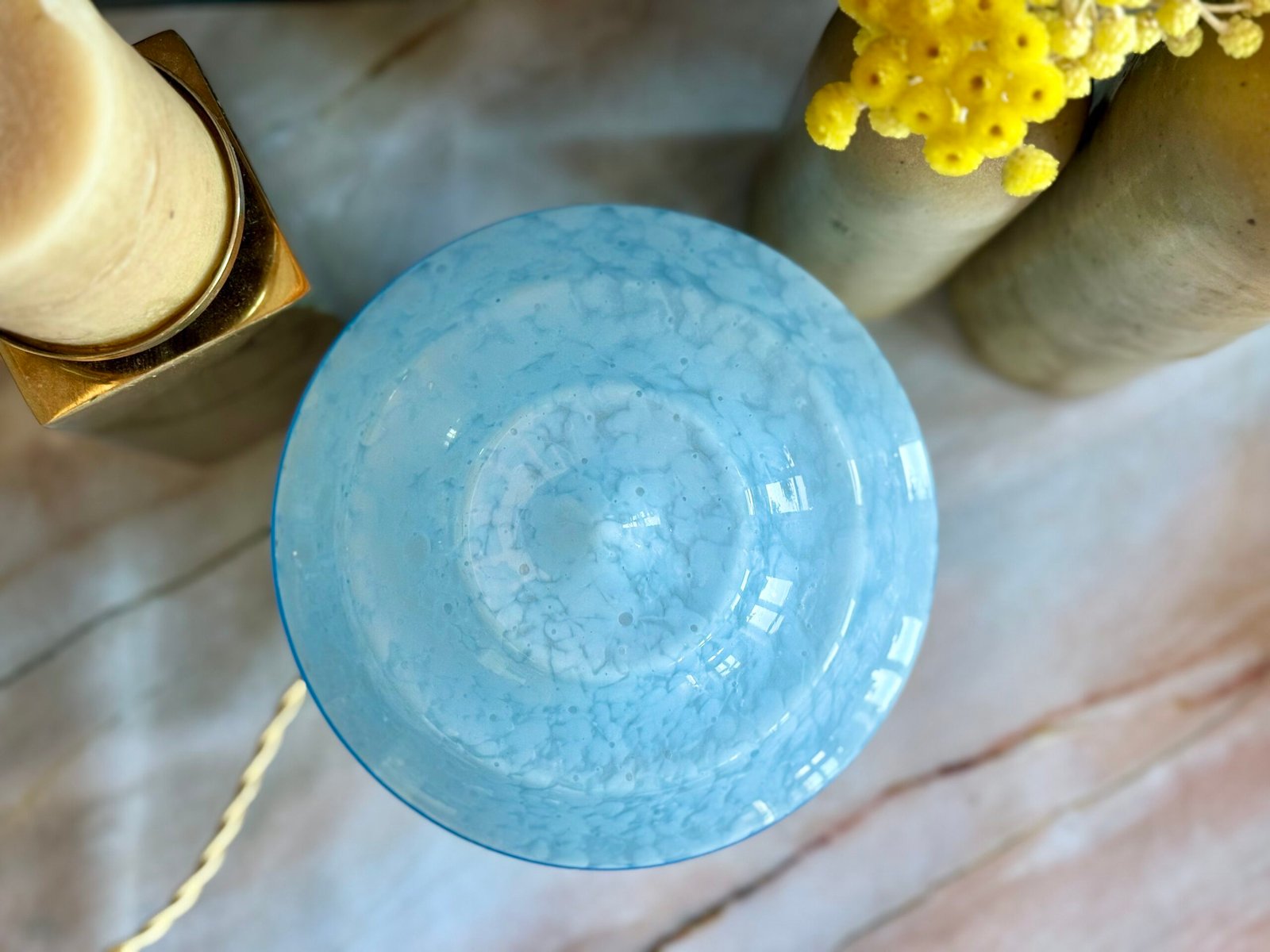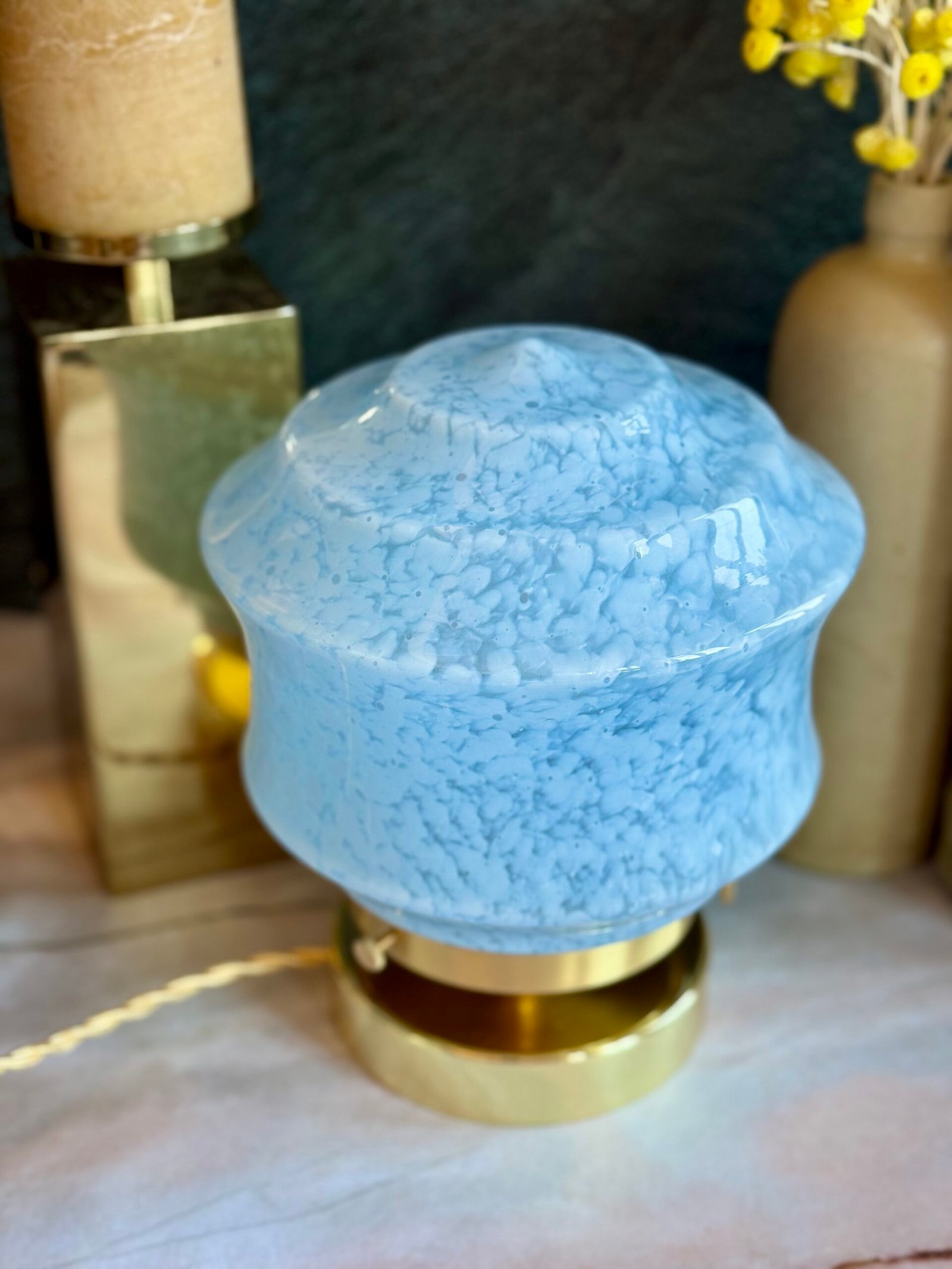 Allumée, la lumière se diffuse à travers le bleu en se transformant. Elle devient plus douce, plus poudrée, presque enveloppante, tandis que les inclusions créent un jeu de profondeur délicat, comme une lumière filtrée à travers un voile de nuages.