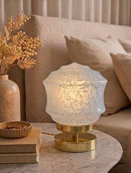 Ce globe ancien en verre moucheté, attribué aux ateliers de Clichy, dévoile une teinte bleue délicate, traversée de nuances laiteuses comme autant de nuages suspendus dans la matière. Ce décor, obtenu lors du travail du verre en fusion, donne au globe une profondeur presque onirique, entre ciel et minéral.
