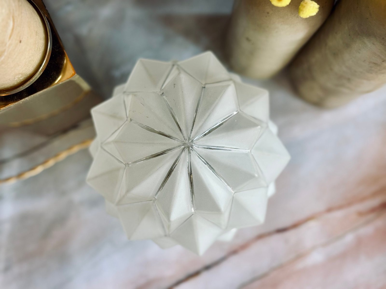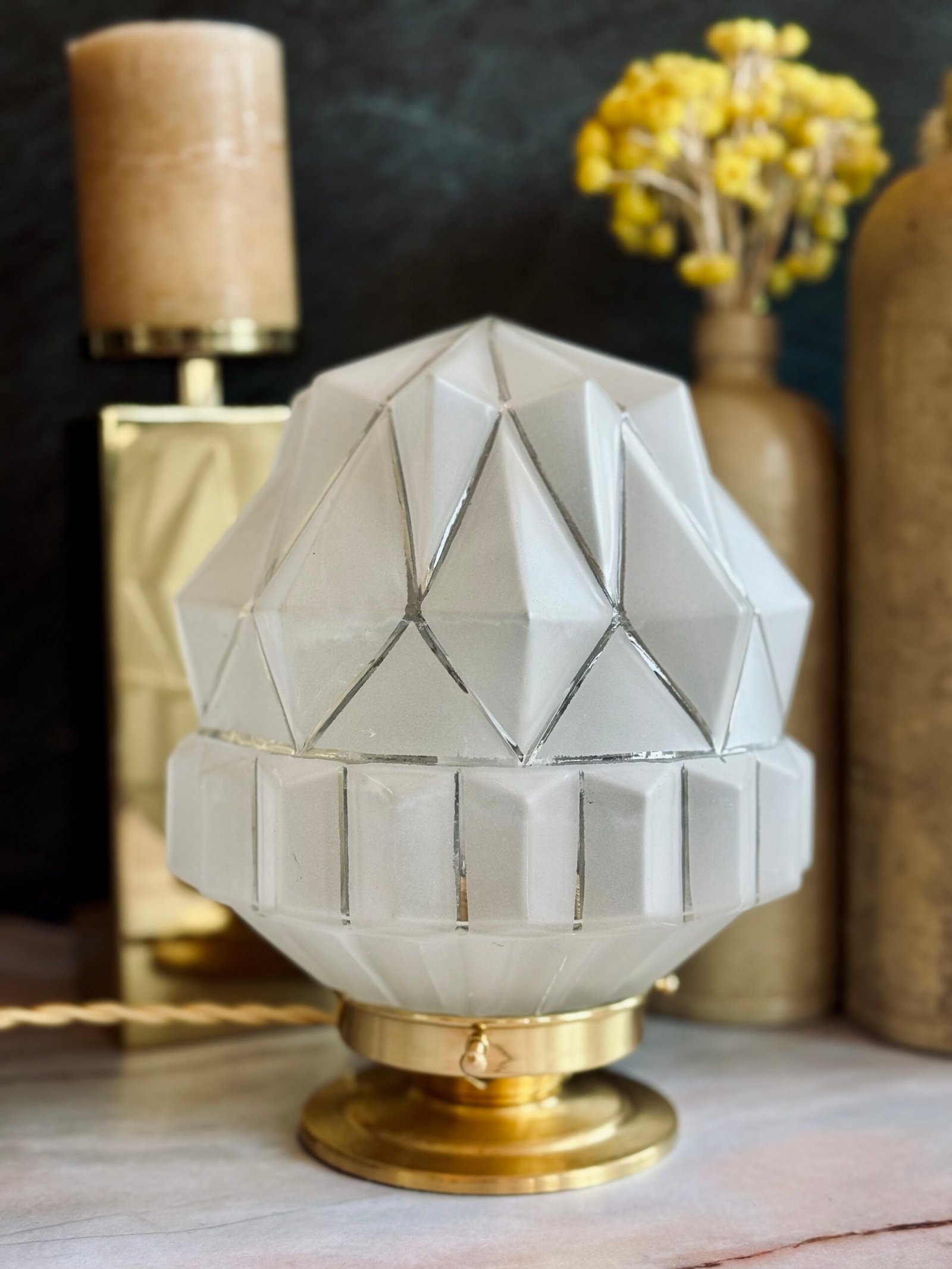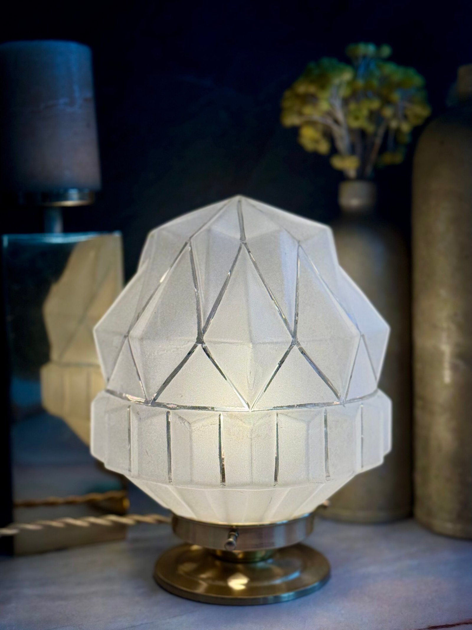 Sa forme facettée, presque architecturale, évoque un volume taillé dans la matière. Chaque face capte la lumière différemment, créant un jeu d’ombres et de reliefs très structuré, typique des années 1930.