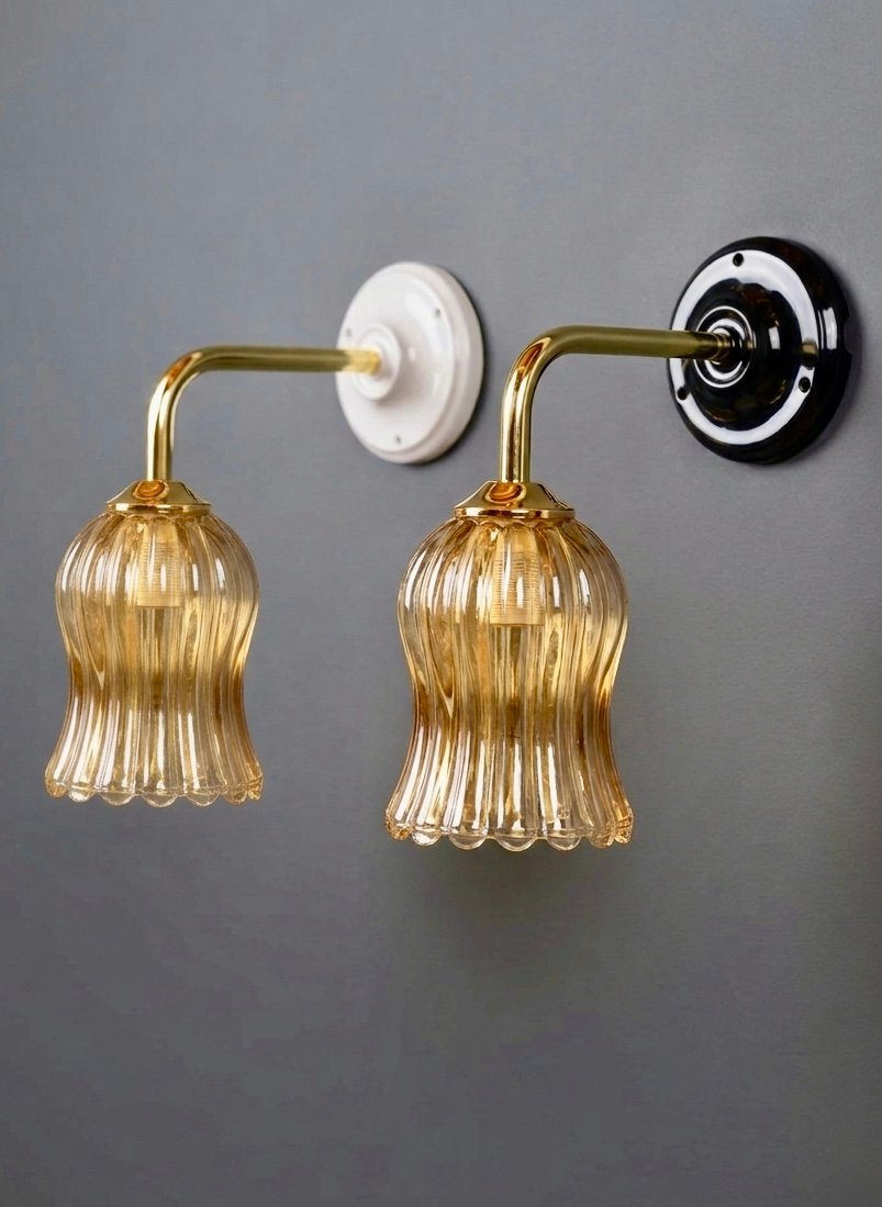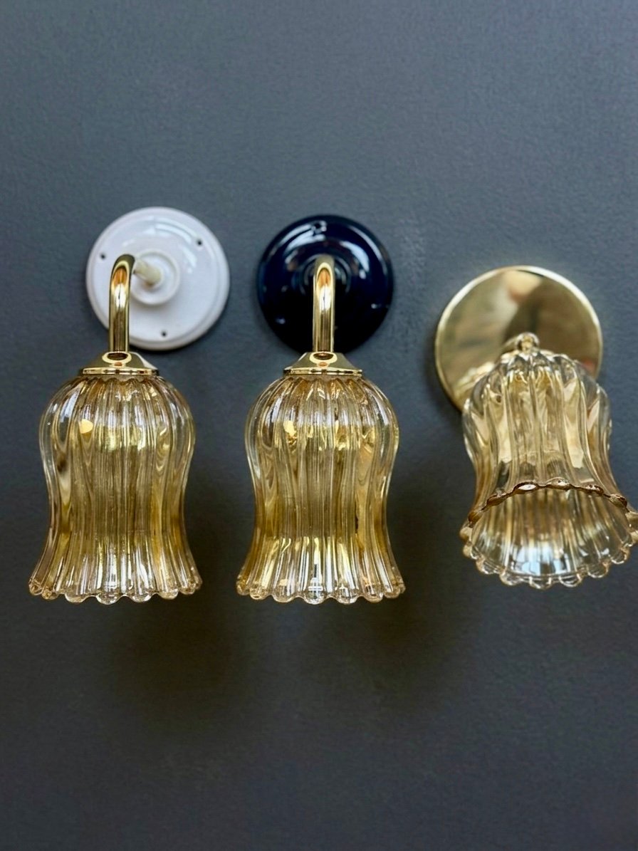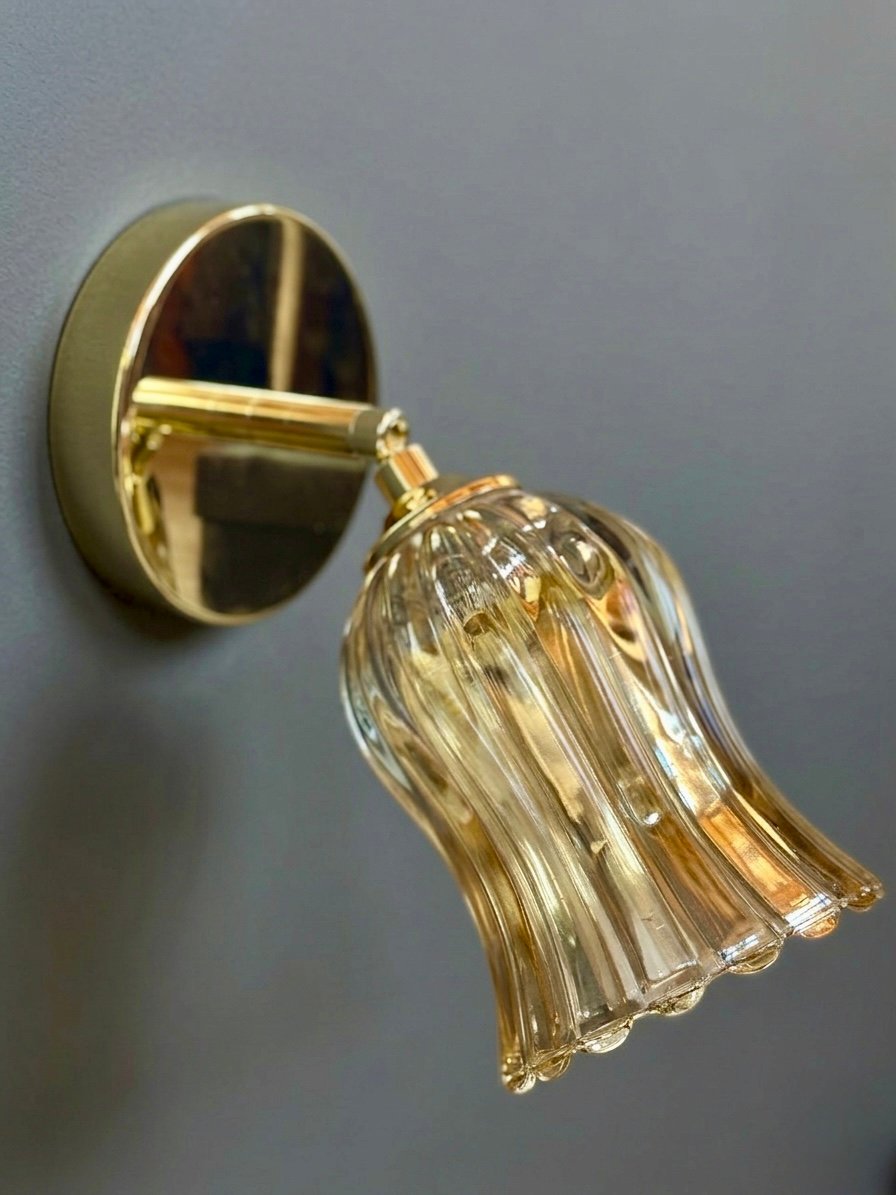 Le globe, en verre moulé légèrement teinté, se structure en longues côtes verticales qui ondulent jusqu’à une base festonnée, presque vivante. Cette silhouette élancée, à la fois fluide et expressive, capte la lumière avec subtilité, laissant apparaître des nuances chaudes, presque miellées, qui évoluent selon l’intensité et l’angle.