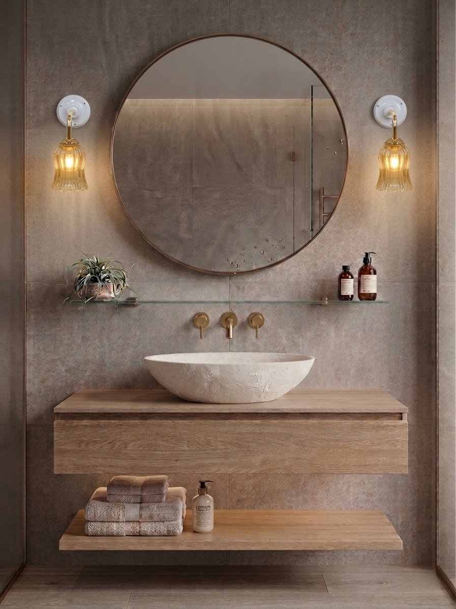 Les rosaces murales offrent plusieurs accords possibles : en porcelaine noire ou blanche pour un contraste franc ou une discrétion lumineuse, ou en laiton doré pour une continuité chaleureuse avec les éléments métalliques.