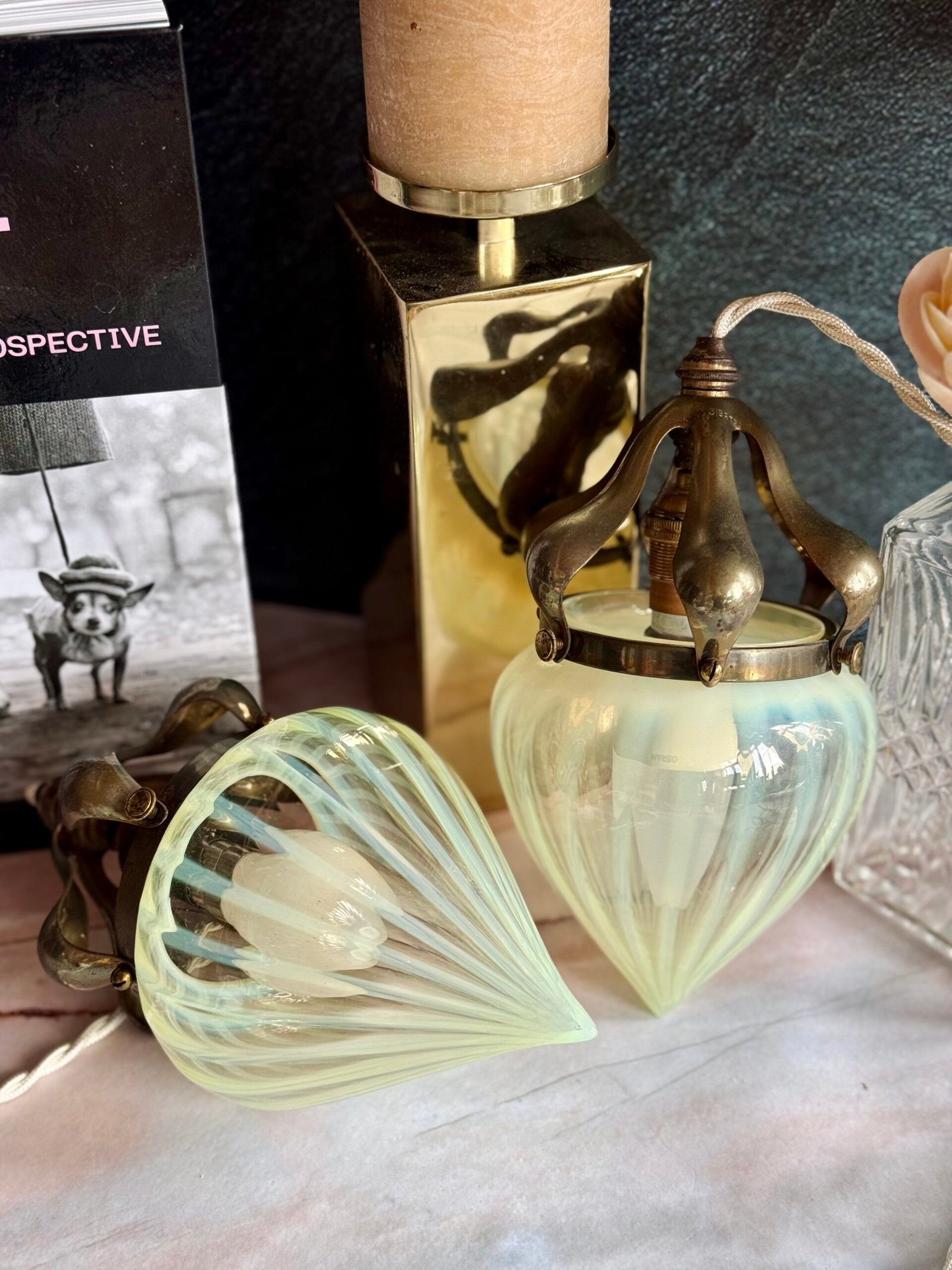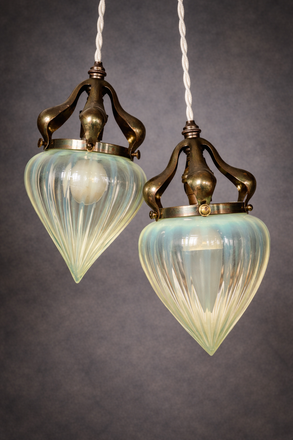 Ces globes sont en réalité réalisés en verre d’ouraline, un verre contenant une faible proportion d’oxyde d’uranium, connu pour sa couleur douce et légèrement irisée. Cette matière particulière était largement utilisée dans les luminaires décoratifs des années 1920-1930, notamment dans les créations de style Art déco.