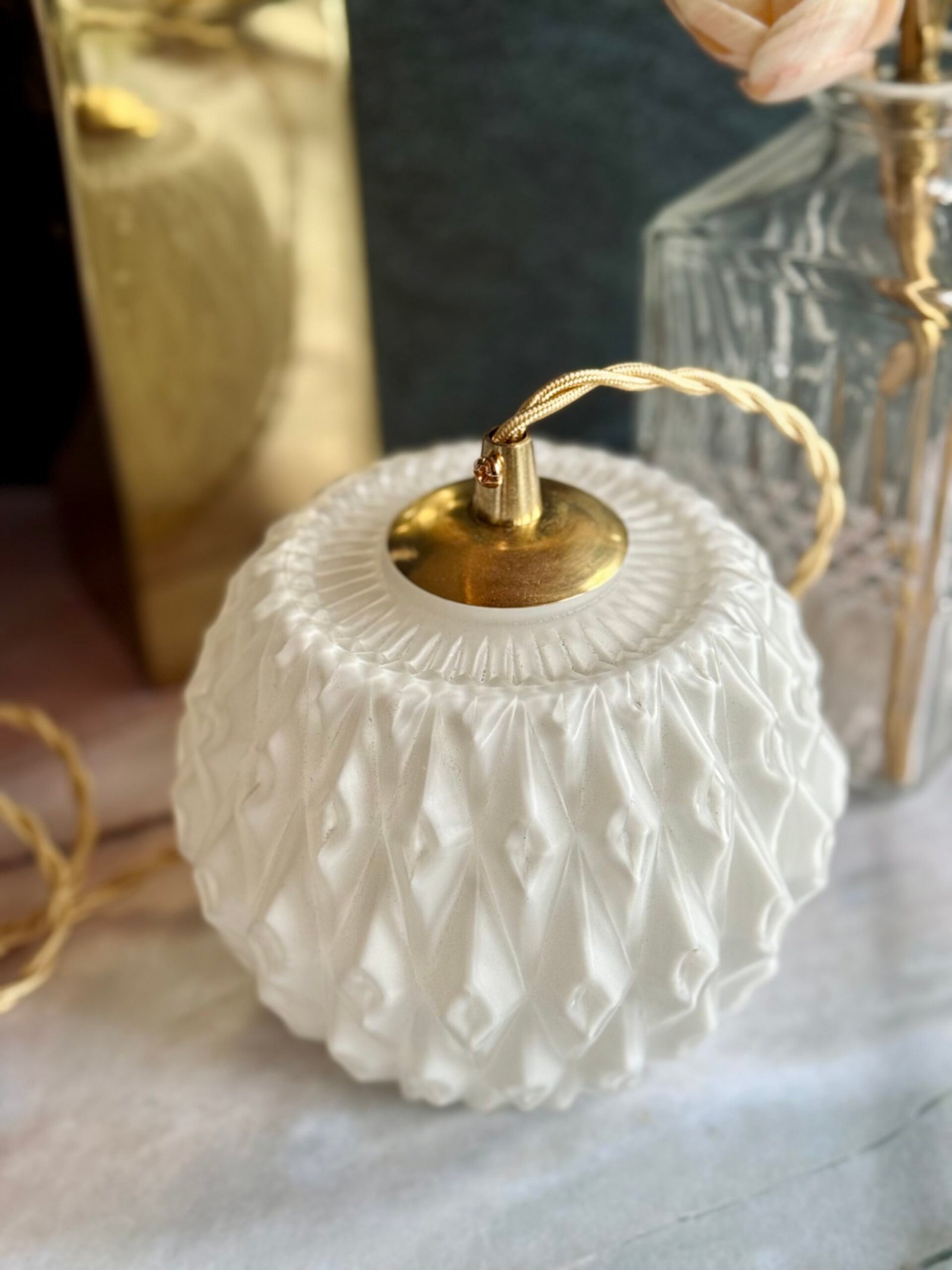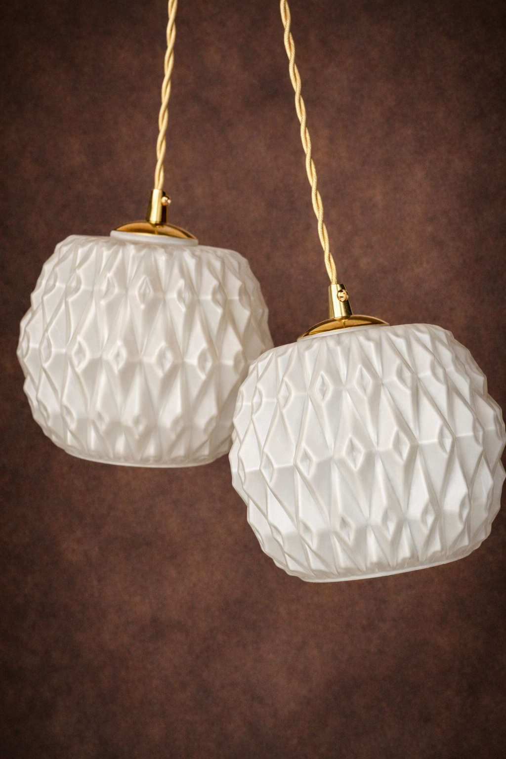 Ces globes anciens en opaline blanche, réalisés dans les années 1960, se distinguent par leur relief géométrique très singulier. Le verre semble avoir été délicatement plié en une succession de facettes et d’arêtes nettes, évoquant la précision d’un origami.