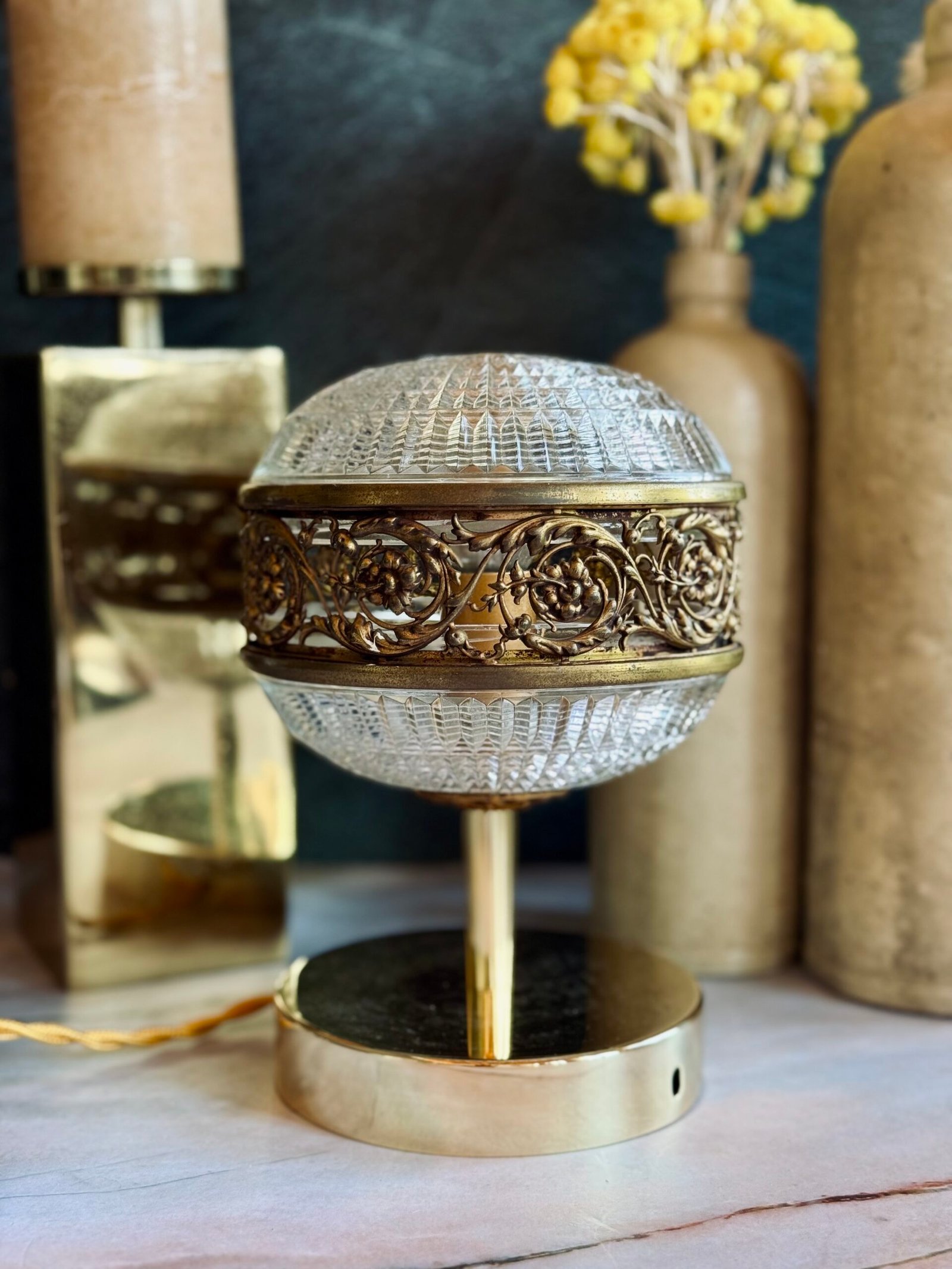 En son centre, une délicate monture ajourée en régule vient ceinturer le globe. Ses motifs de rinceaux et de fleurs, finement travaillés, apportent une dimension ornementale précieuse, presque joaillière, contrastant avec la rigueur fonctionnelle du verre.