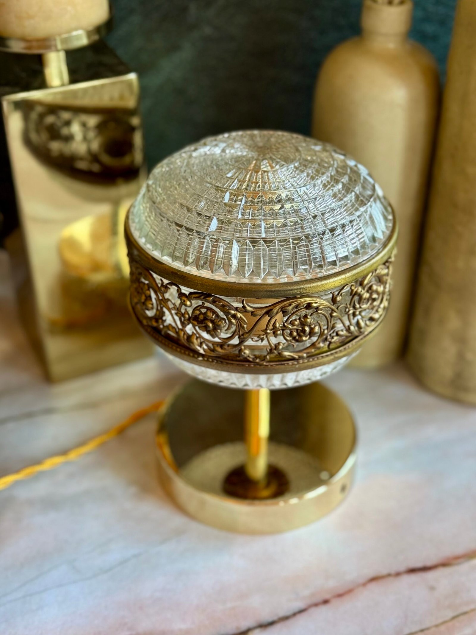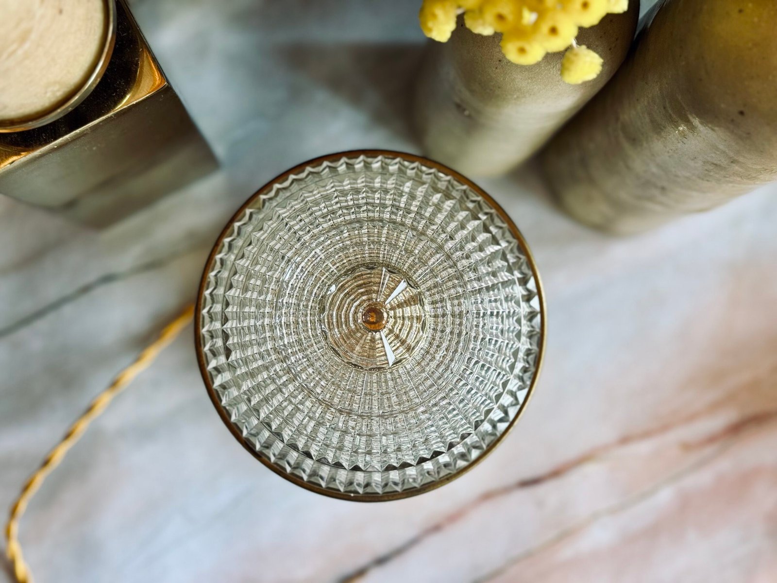 Lorsque la lampe est allumée, la lumière se diffracte à travers les reliefs du verre, tandis que la monture projette de légers jeux d’ombres, créant une atmosphère à la fois structurée et chaleureuse.