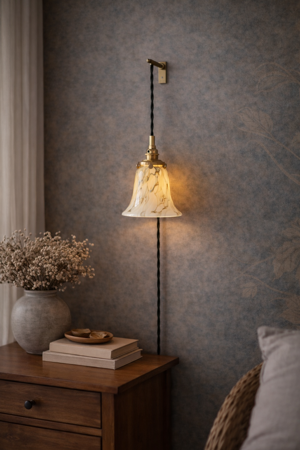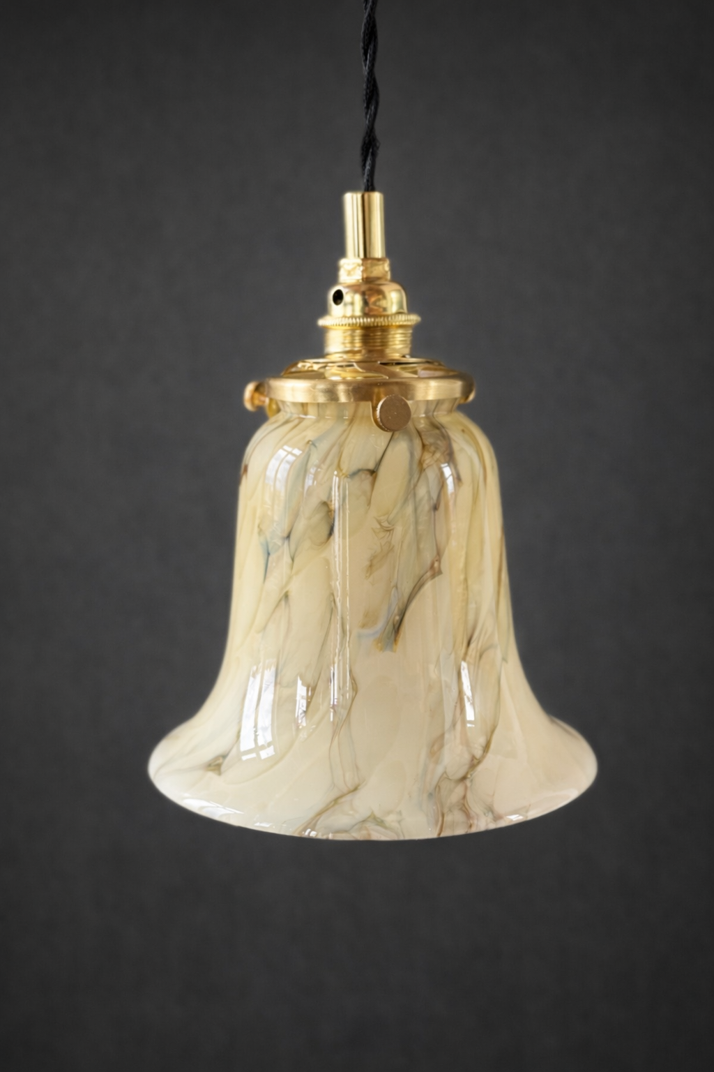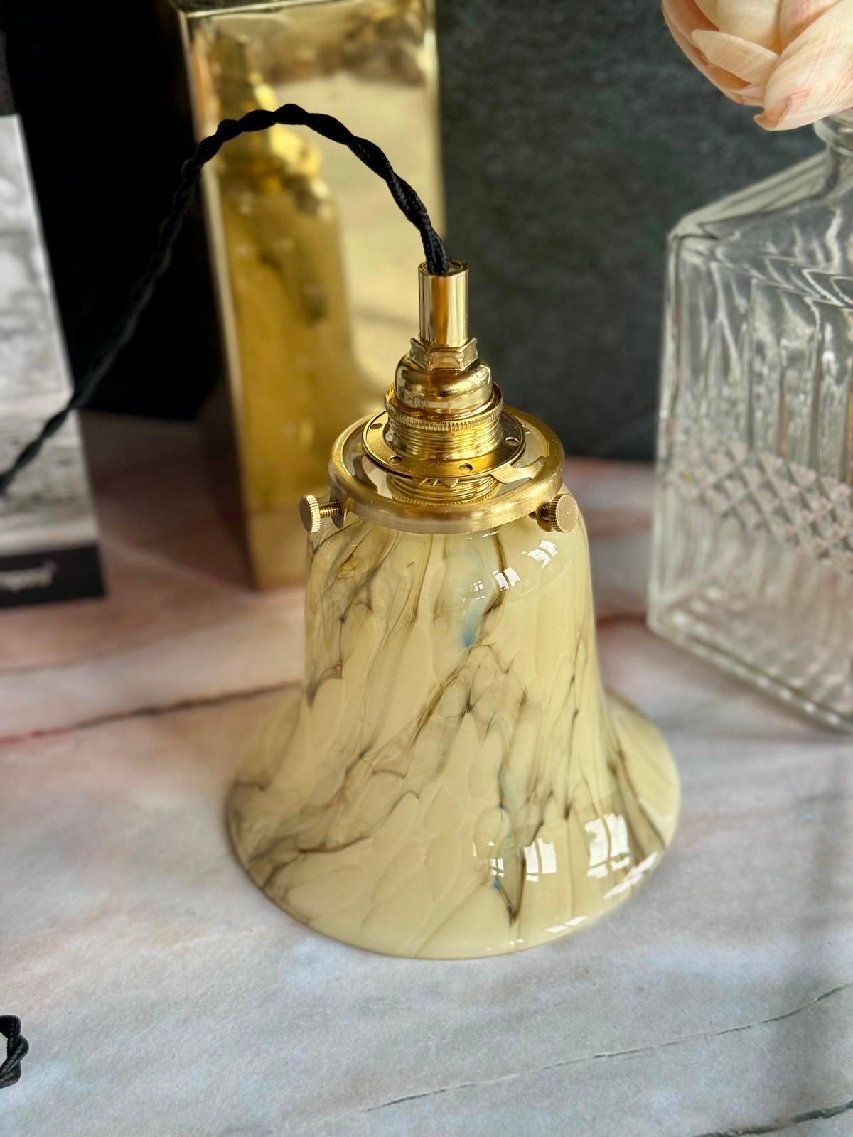 Montée sur une finition en laiton et suspendue à son cordon textile, elle s’intègre avec douceur dans l’espace, comme une présence calme et naturelle.
