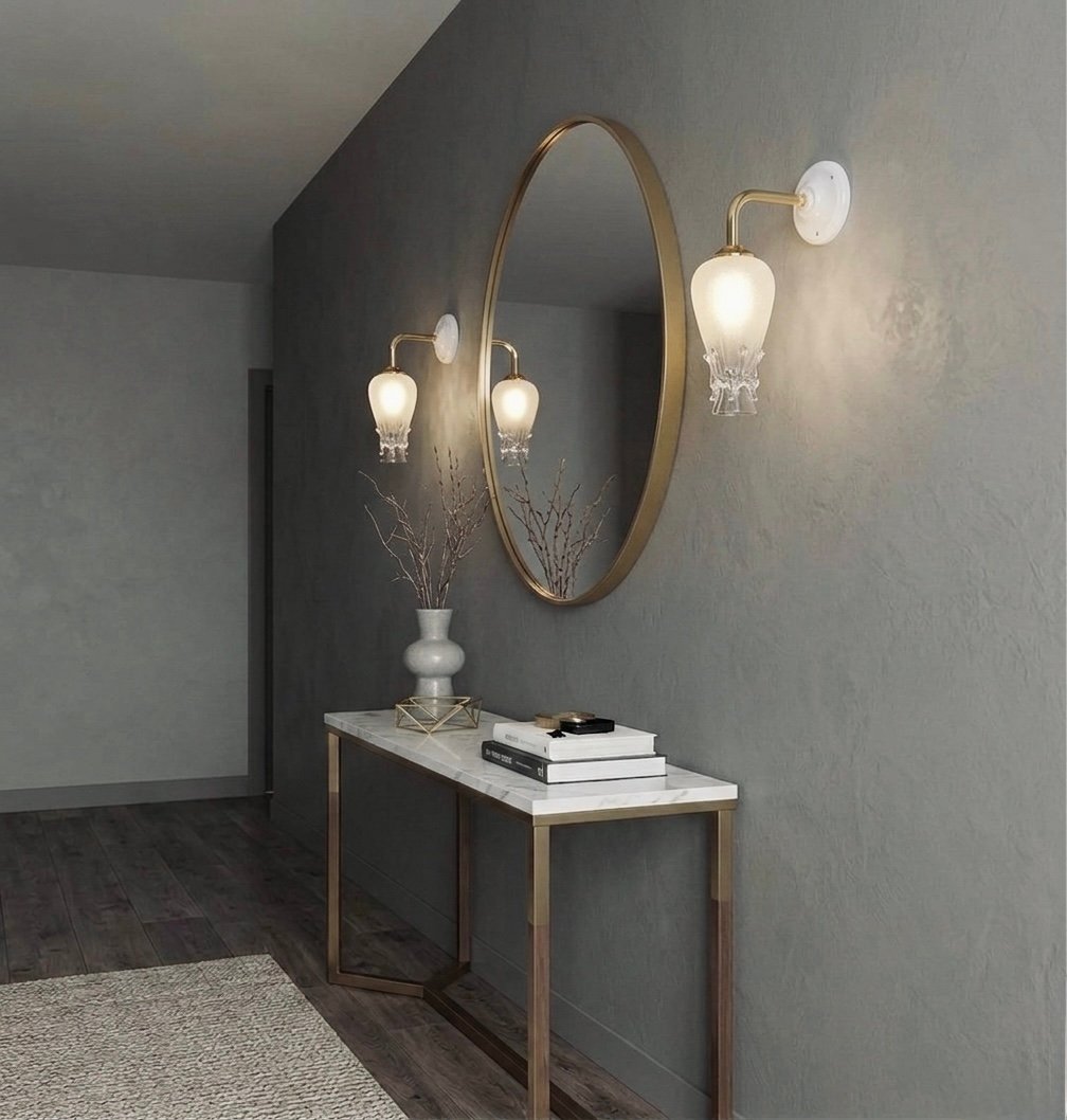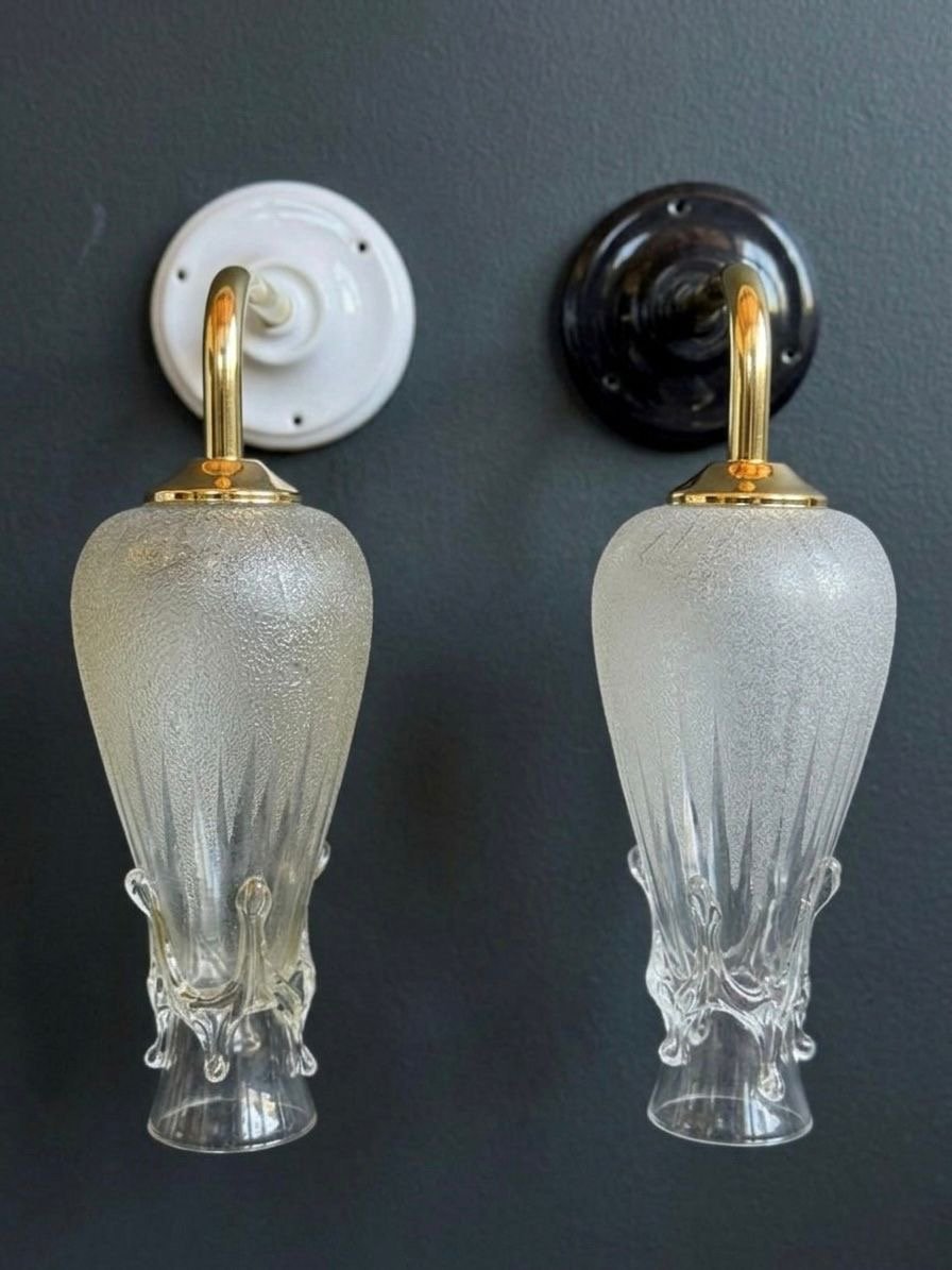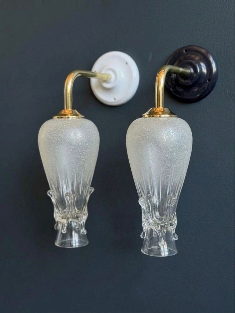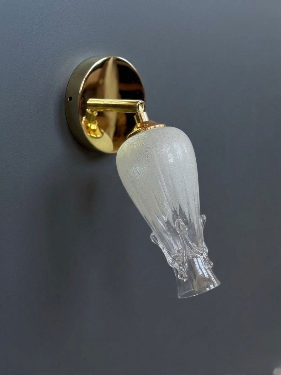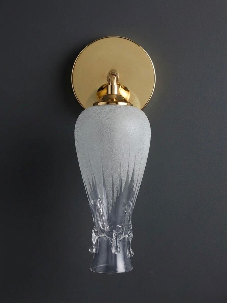 Ces appliques semblent capturer un instant suspendu, celui où la matière se transforme. La partie haute, en verre délicatement granité, adoucit la lumière et la diffuse comme à travers un filtre naturel. Plus bas, le verre devient limpide, laissant apparaître toute sa transparence.
