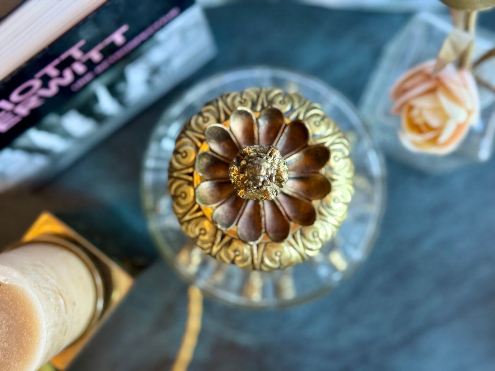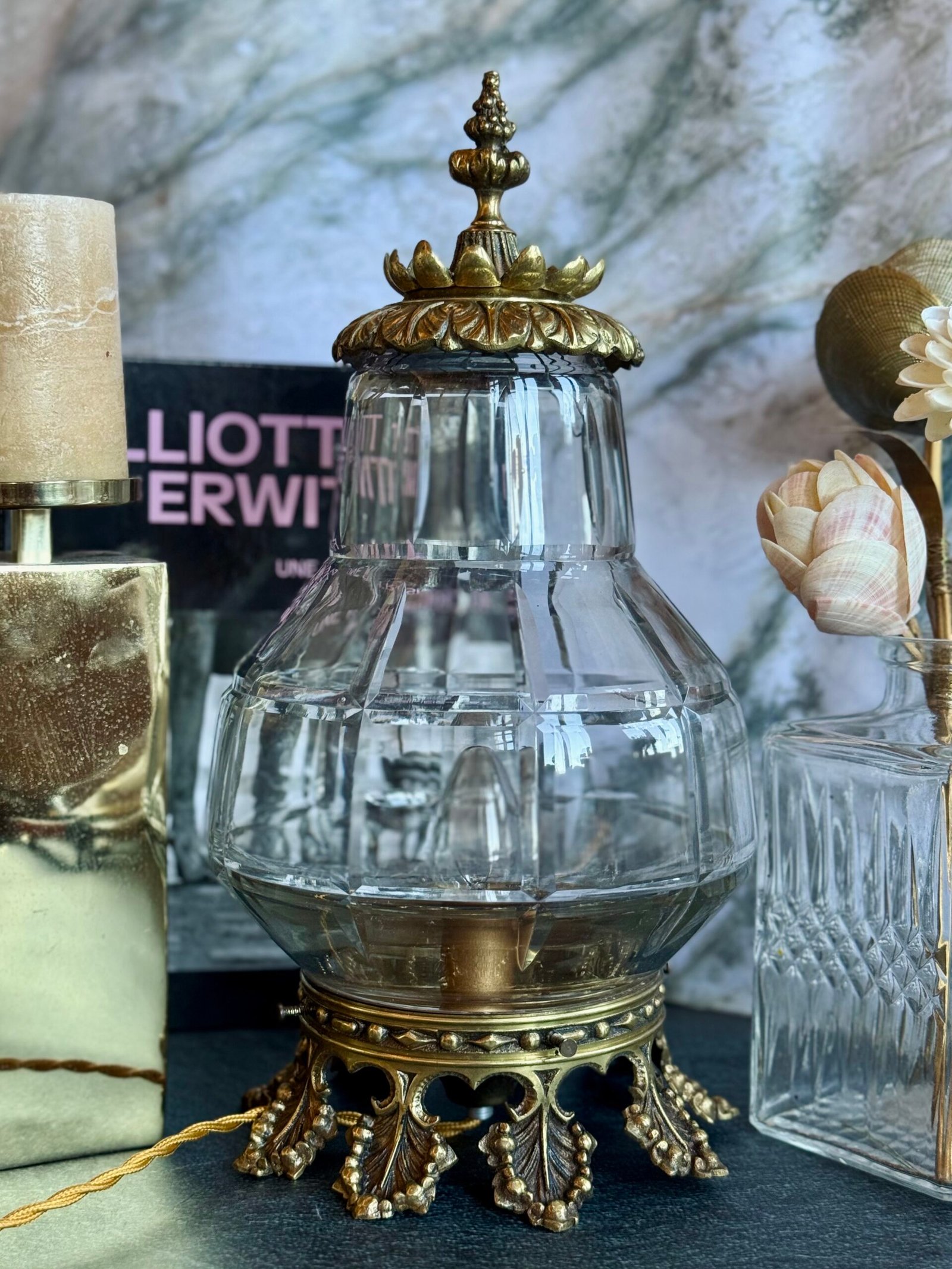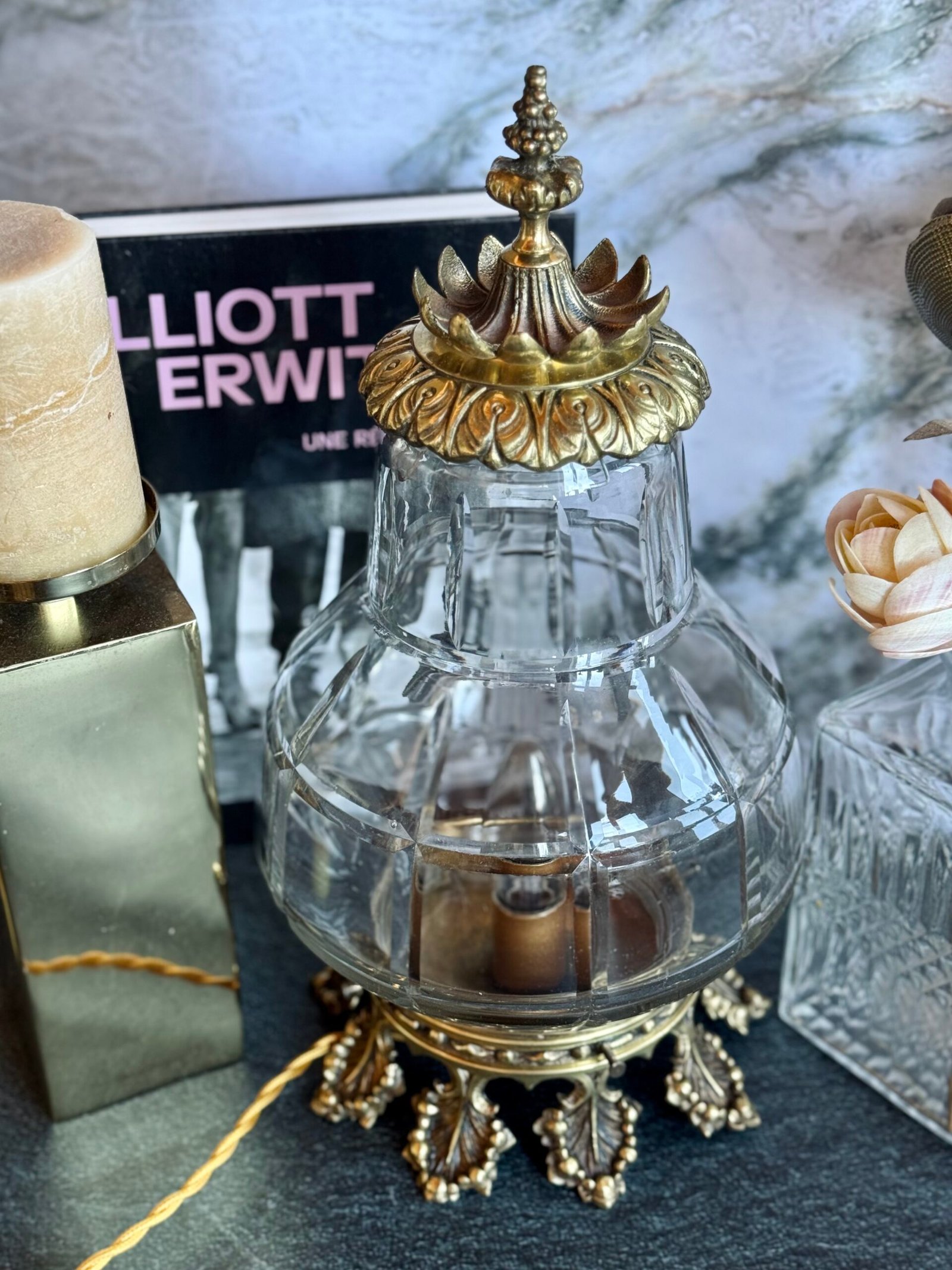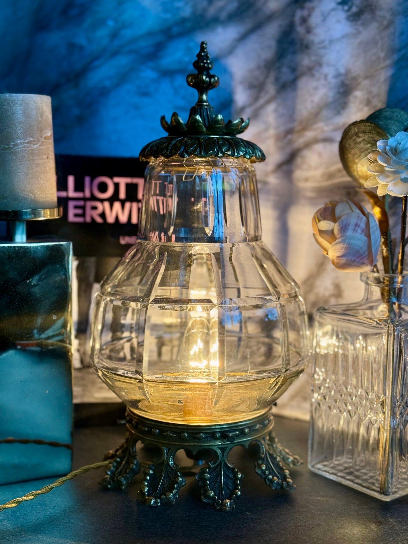 Avec près de 38 cm de hauteur, Veilleuse Impériale est une pièce au format généreux qui attire naturellement le regard. Allumée, elle diffuse une lumière chaleureuse qui met en valeur la transparence du verre et la richesse du métal.